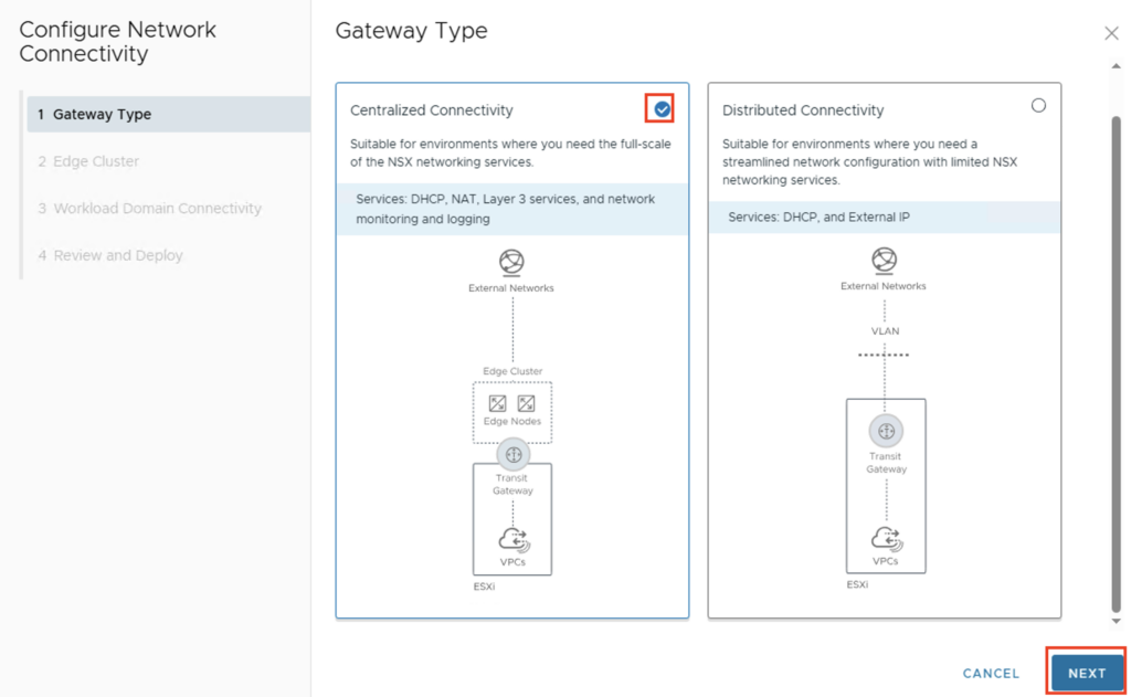 A new input screen will open, and the first step is to specify the gateway type. For most applications, the “Centralized Connectivity” type should be selected, as this provides services via the NSX Edges (DHCP, NAT, Layer 3 services, and network monitoring and logging).