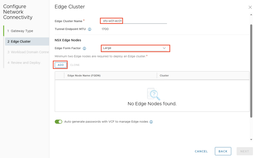 We’ll now be prompted to configure the Edges. We’ll start by giving the Edge Cluster a name and selecting the Edge form factor. We’ll then add the first Edge using “ADD.”