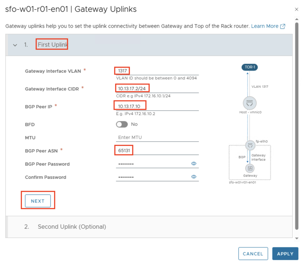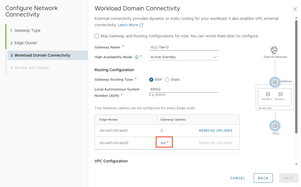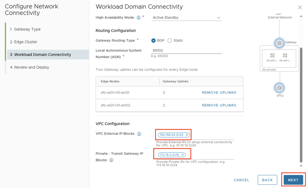 For Workload Domain Connectivity, the parameters for the T0 gateway are entered.