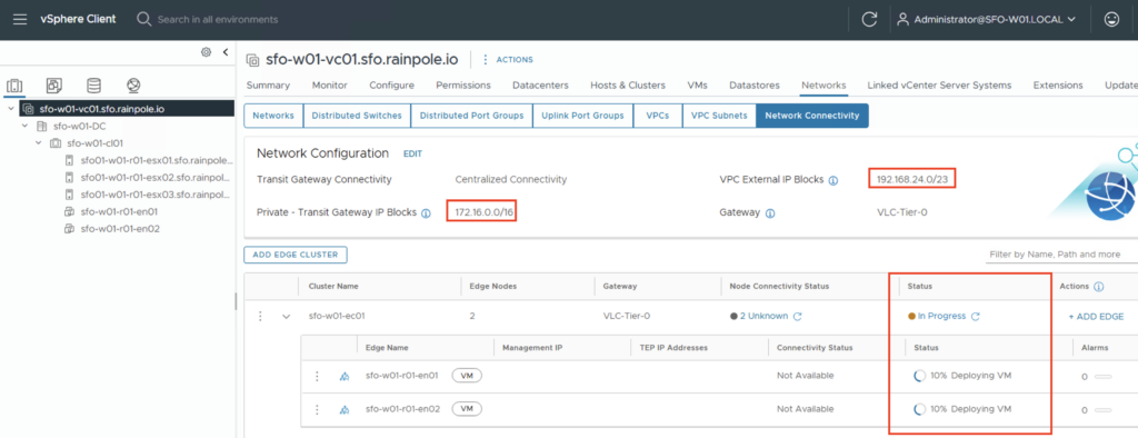 You’ll then return to the vCenter view and see how the Edge Cluster is being created. In the Network Configuration, you’ll also see the information about the IP blocks we created in the last step. Depending on your environment, the installation may take a moment.