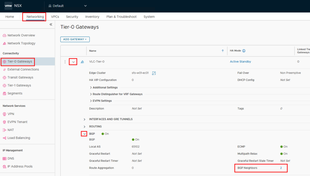 Once the deployment has been successfully completed, we can connect to the NSX Manager and check whether the connections between the T0 gateway and the external router have been established properly. After successfully logging into the NSX Manager, we should check the BGP neighbor status. This can be found under Networking -> Tier-0 Gateways -> ROUTER-NAME -> BGP -> BGP Neighbors.