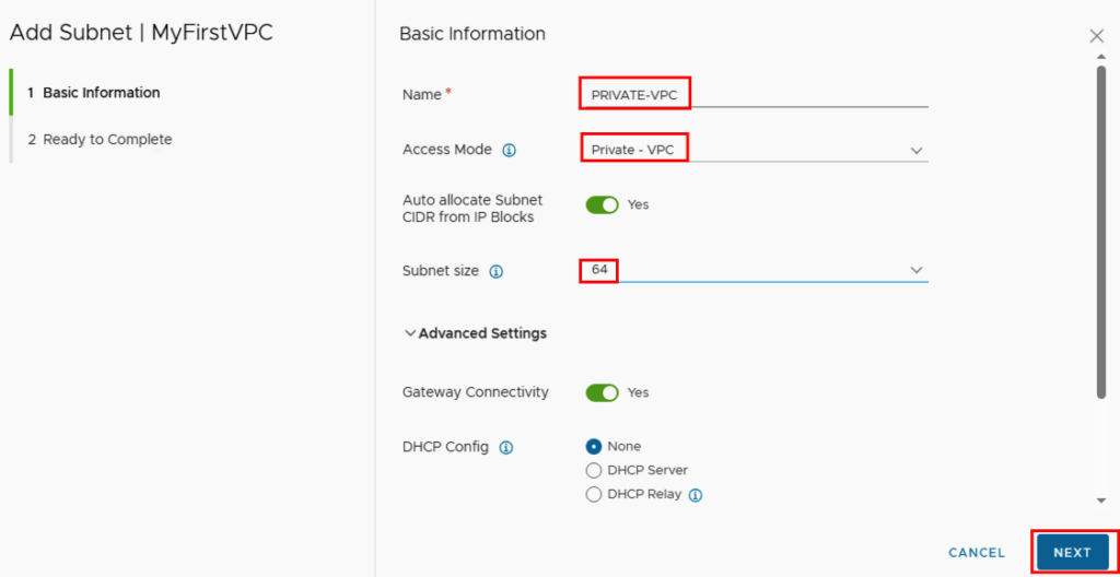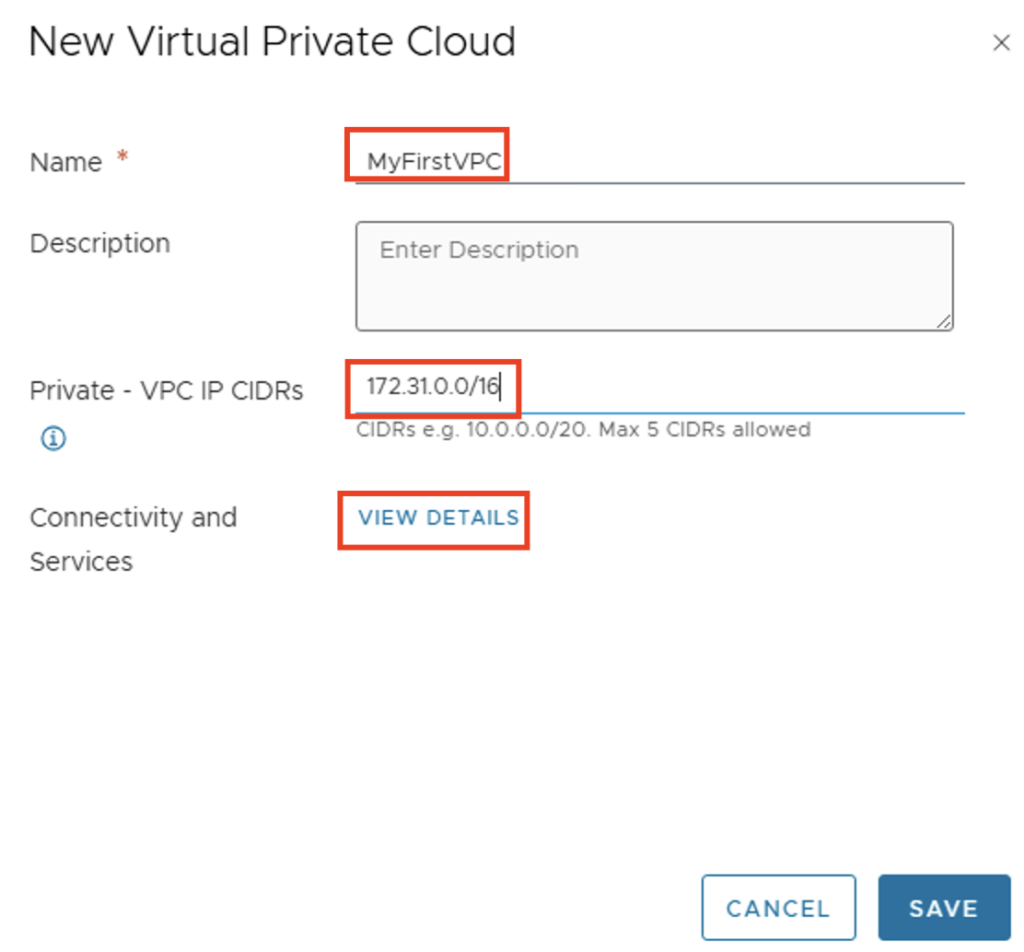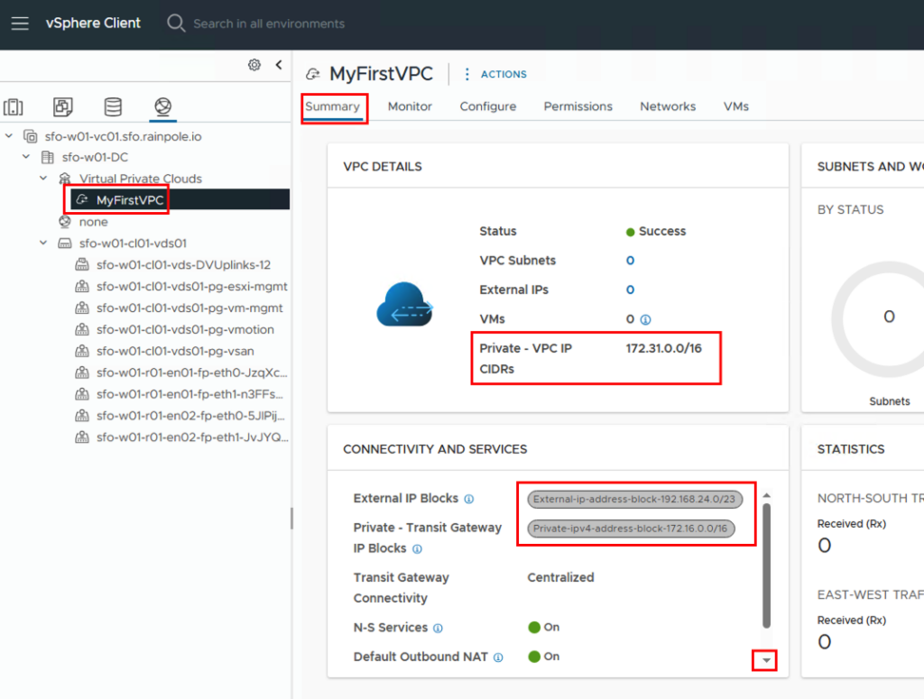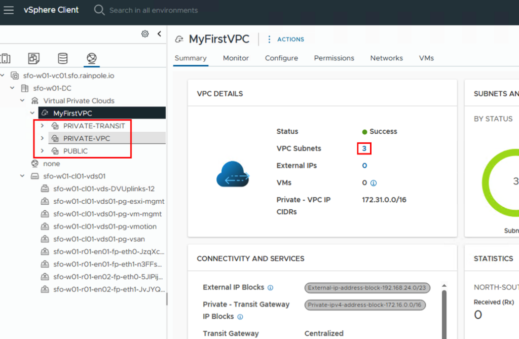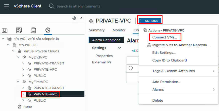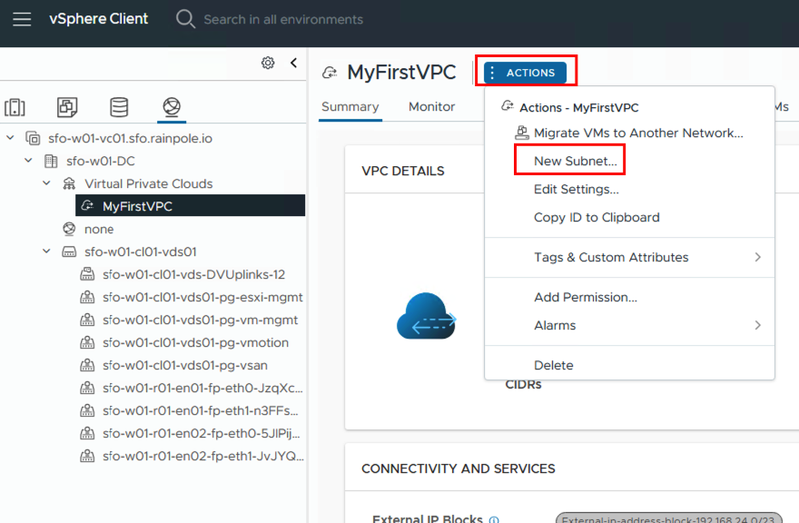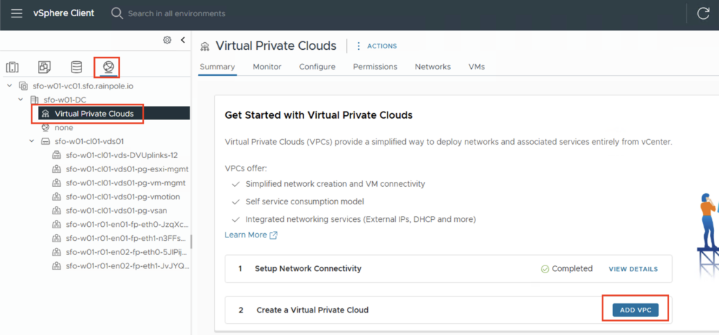 Now it’s time to create our first VPC. To do this, go back to vCenter and click on the Network tab -> Virtual Private Clouds -> “ADD VPC”
