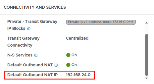 In the summary, we see information about the IP blocks and the number of configured networks, which is currently set to 0. If you scroll down in the “CONNECTIVITY AND SERVICES” field, you’ll also see the default outbound NAT address.