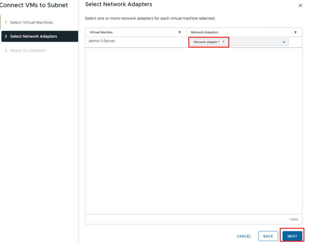 First, the VMs are selected and then the network adapters (if the VM has several configured)