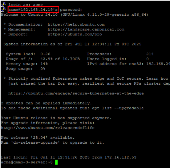 Test 1: SSH from my PC (external) to demo-3-server (192.168.24.19) in the public network.