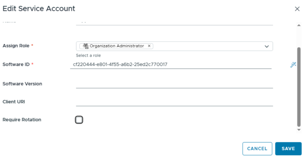 During creation of a service account, you need to assign the role this api access is being granted for and create a Software ID which represents the actual application. For the latter you could define your own ID but Iād recommend using the auto-create functionality. The other parameters are optional and can be considered metadata for the respective application.
