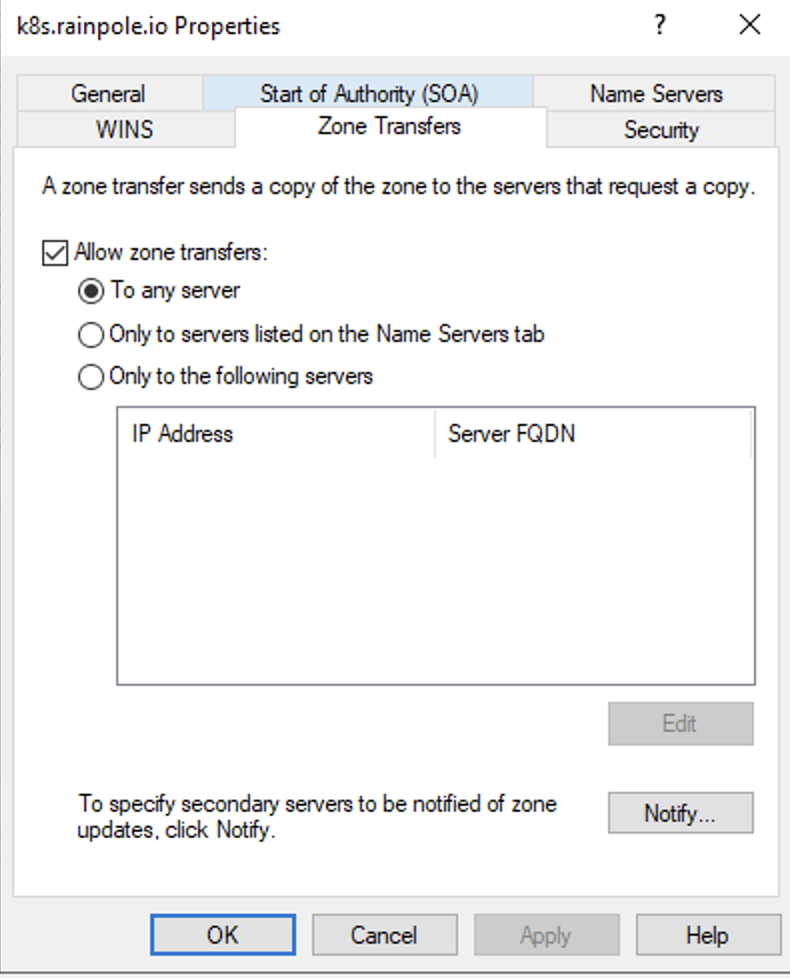 On the Zone Transfers tab, check the box next to Allow zone transfers