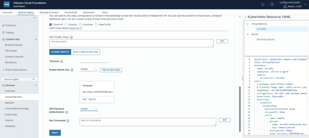 To deploy the VM from the VCF Automation GUI, we can create a Blueprint and make it available in the Catalog