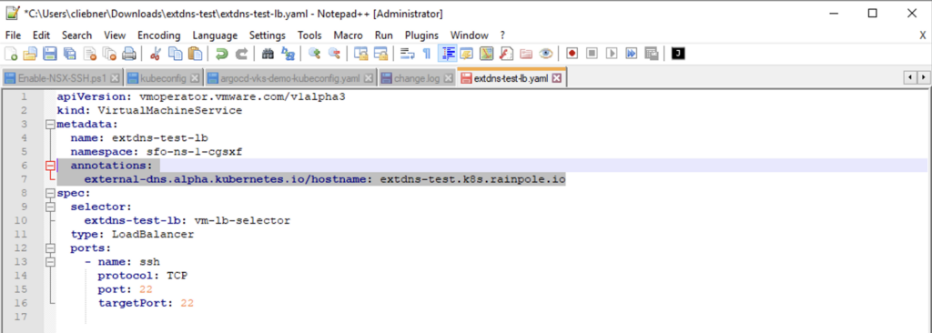 Edit the Load Balancer YAML and add the Annotation with the hostname (FQDN). The DNS zone needs to match the rfc2136-zone and domain-filter parameter from the ExtDNS configuration file.
