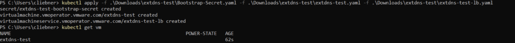kubectl apply -f <secret yaml> -f <vm yaml> -f <lb yaml>