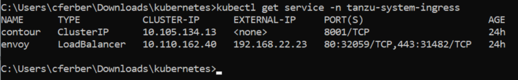 Please note the IP address of the envoy LoadBalancer service (192.168.22.23 in this case) as this is the IP you must point your DNS entries to.